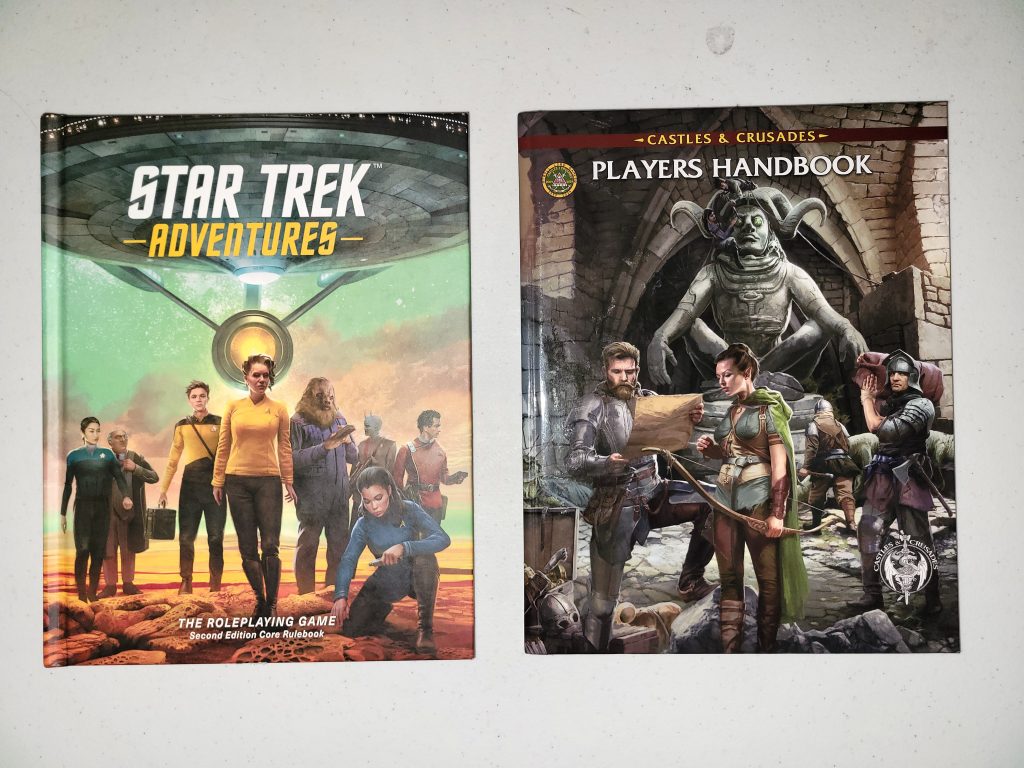 So, apparently I have to ask myself. Am I insane? And clearly the answer is yes. I’ve been wanting to get a group of friends together and run a role-playing campaign. But the question was, which one? I’m a big fan of Star Trek (duh) and I’ve been really enjoying running Star Trek Adventures 2nd Edition at SaltCON. I also want to homebrew some items for STA2e to carry on the memory of my friend Roger Taylor. But, I’ve also been wanting to run a fantasy RPG. I had several ideas rolling around my head plus I had a ton of modules in both PDF and dead-tree formats. I didn’t know which campaign I wanted to run, Trek or Fantasy. So… why not both?