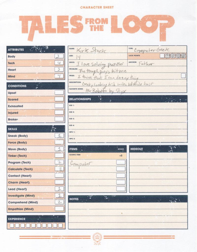 I think I transfer information to the sheet. The checklist states that the resilience is 10 and the asset points is 0. I noticed that there were several sections not filled in on the character sheet. Complications (which happens during game play) and Tasks in Progress. This last item I believe that the GM would let me know what to put here. I scanned both sheets so you could see them.